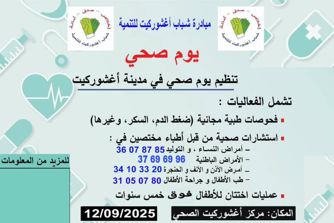 أعلنت مبادرة شباب أغشوركيت عن تنظيم يوم صحي مفتوح يوم الجمعة المقبل بمباني المركز الصحي في المدينة، يتضمن استشارات مجانية مع أطباء وأخصائيين في مجالات متعددة.