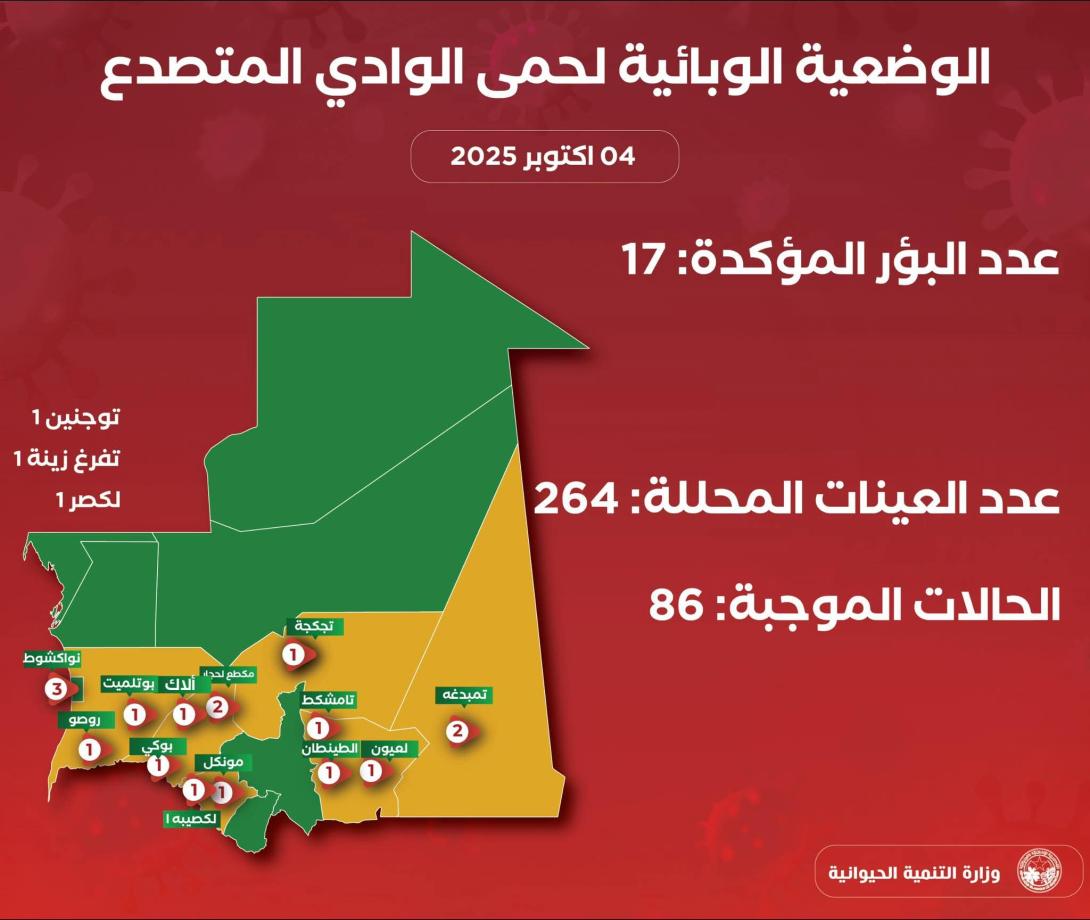 سجلت المصالح البيطرية التابعة لوزارة التنمية الحيوانية حتى الرابع من أكتوبر 2025، ما مجموعه 17 بؤرة مؤكدة لحمى الوادي المتصدع، منتشرة عبر 15 مقاطعة ضمن ثماني ولايات.