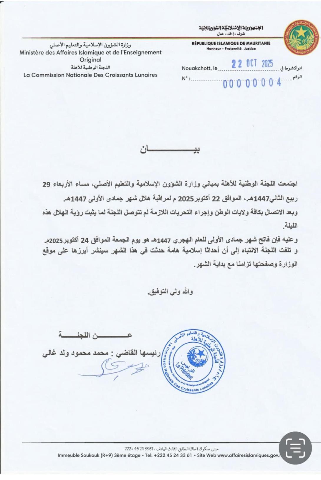 وجاء في بيان اللجنة أن اجتماعها اليوم لم يسفر عن أي مشاهدة مؤكدة للهلال، مما دفعها إلى الإعلان عن أن يوم الجمعة الموافق 23 أكتوبر 2025 سيكون هو أول أيام شهر جمادى الأولى.