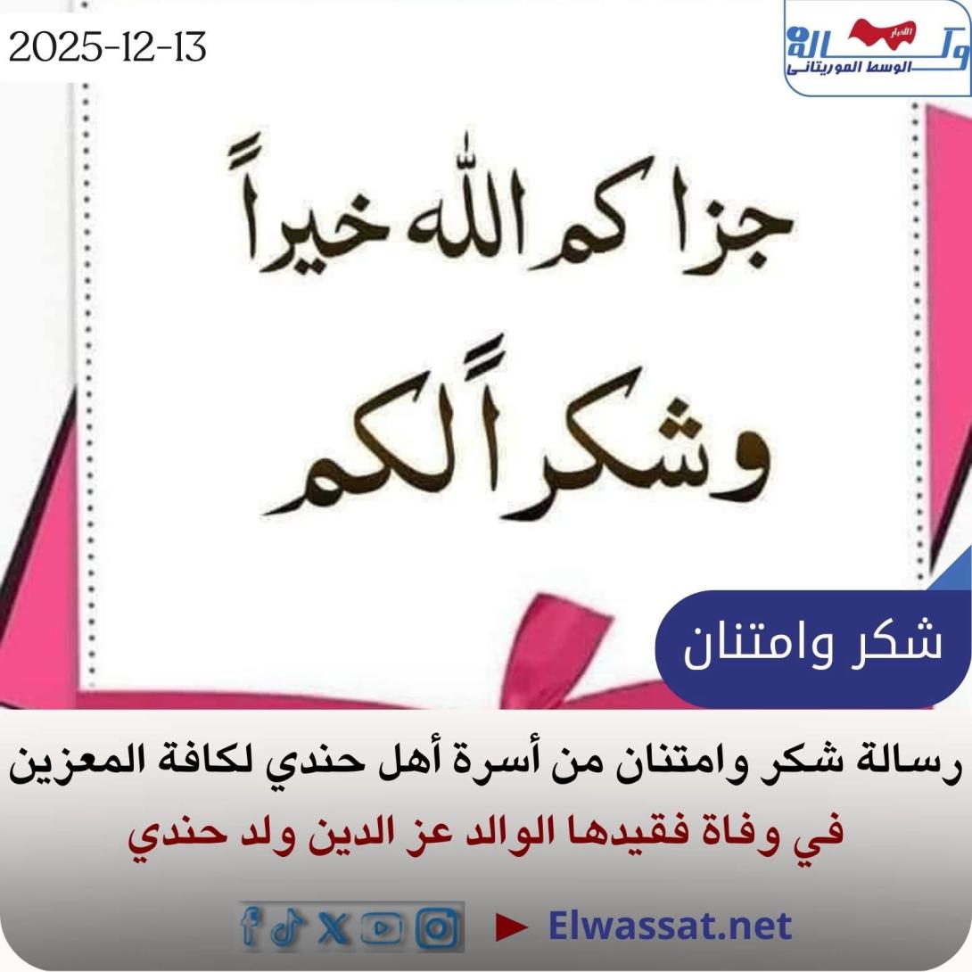 الوسط الموريتاني (رسالة شكر وامتنان) تتقدّم أسرة أهل حندي، بمشاعر صادقة من الشكر والامتنان، بخالص العرفان وجزيل التقدير إلى جميع من واساها في مصابها الجلل، وشاركها حزنها صدقا فى المشاعر ونبلا فى الكلمات، وحضورًا وتشريفًا للعزاء، أو تحمّلًا لمشقة السفر وعناء الطريق، أو اتصالًا وسؤالًا، أو دعاءً خالصًا ممن حالت الظروف دون حضوره، فكان قريبًا من القلوب وإن باعدت المسافات.