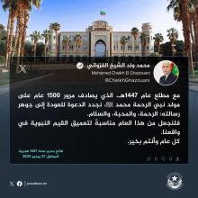 دعا الرئيس الموريتاني، محمد ولد الشيخ الغزواني، إلى جعل العام الهجري 1447 مناسبة لتعميق القيم النبوية في واقع الأمة، مشددًا على ضرورة العودة إلى جوهر الرسالة النبوية المتمثلة في الرحمة والمحبة والسلام.