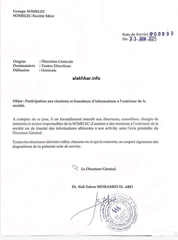 ووقّع المدير العام للشركة سيدي ولد سالم أمس الاثنين تعميما منع بموجبه المسؤولين في الشركة من حضور أي اجتماعات خارج الشركة أو تقديم معلومات تتعلق بأنشطتها دون إشعار مسبق من المدير العام.
