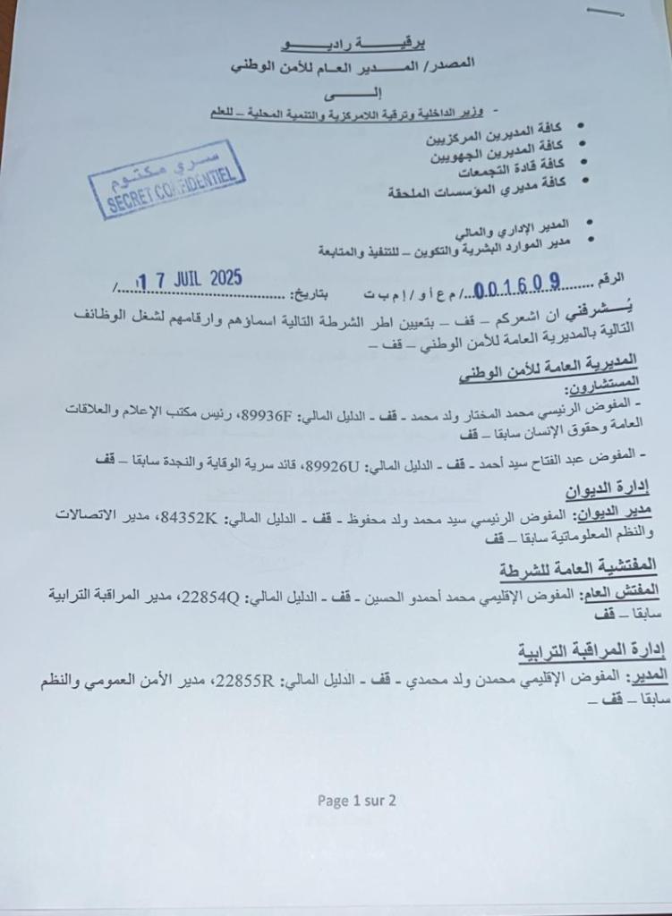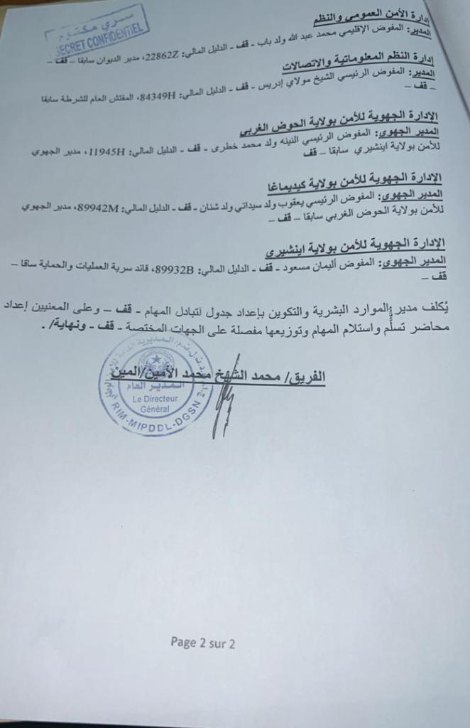 أجرى المدير العام للأمن الوطني الفريق محمد الشيخ ولد محمد الأمين، اليوم الخميس، تغييرات في صفوف كبار الضباط، شملت تعيين مستشارين ومديرين جهويين في بعض الولايات.