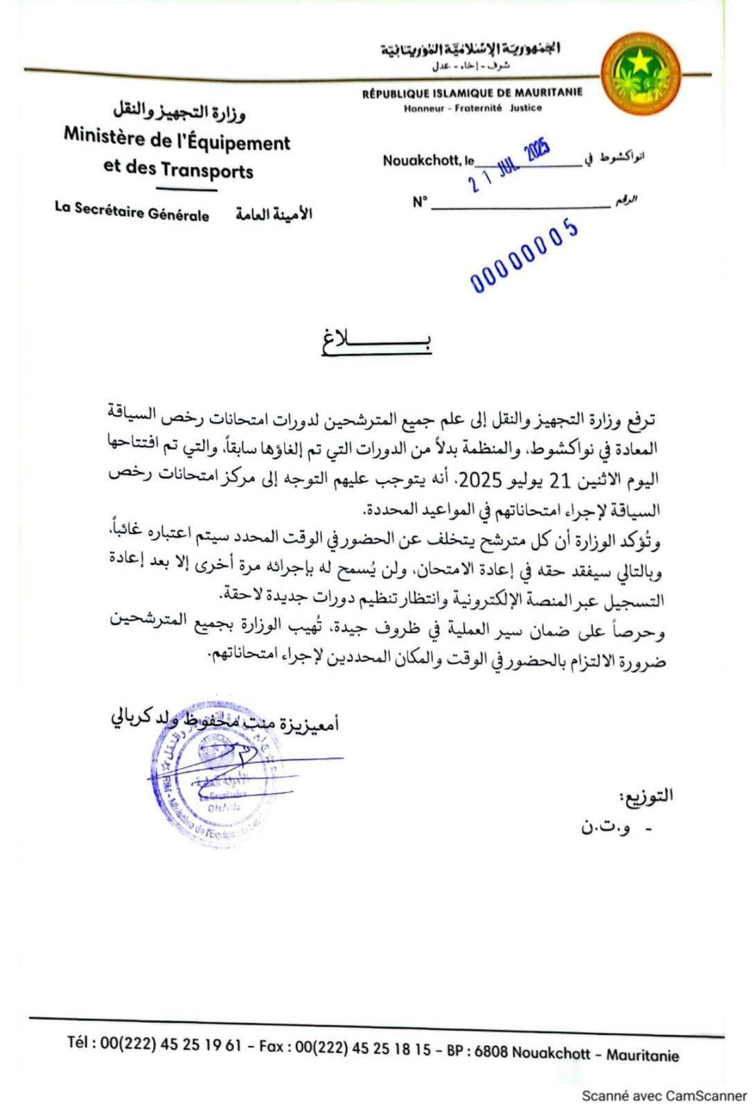دعت وزارة التجهيز والنقل المترشحين لدورات امتحانات رخص السياقة المعادة في نواكشوط إلى التوجه إلى مركز امتحانات رخص السياقة لإجراء امتحاناتهم في المواعيد المحددة.