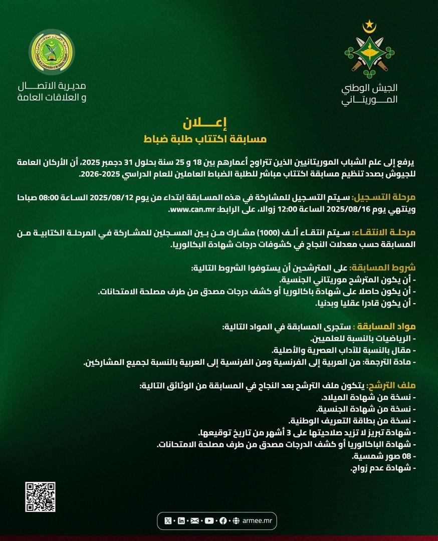 أعلن الأركان العامة للجيوش لجميع الشباب الموريتانيين الذين تتراوح أعمارهم بين 18 و25 سنة حتى 31 ديسمبر 2025، عن تنظيم مسابقة اكتتاب مباشر للطلبة الضباط العاملين للعام الدراسي 2025-2026.