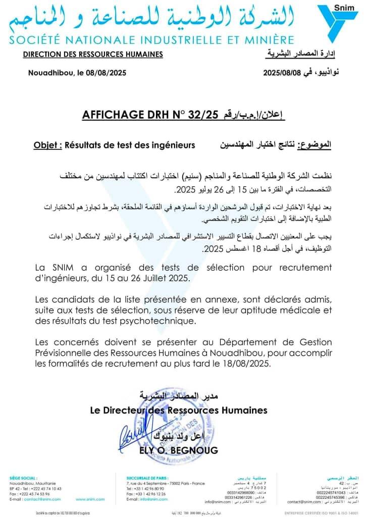 أعلنت الشركة الوطنية للصناعة والمناجم (سنيم) عن النتائج النهائية لمسابقة توظيف المهندسين التي جرت خلال الفترة من 15 إلى 26 يوليو 2025. وقد أسفرت المسابقة عن اختيار تسعة فائزين من مختلف التخصصات الهندسية.