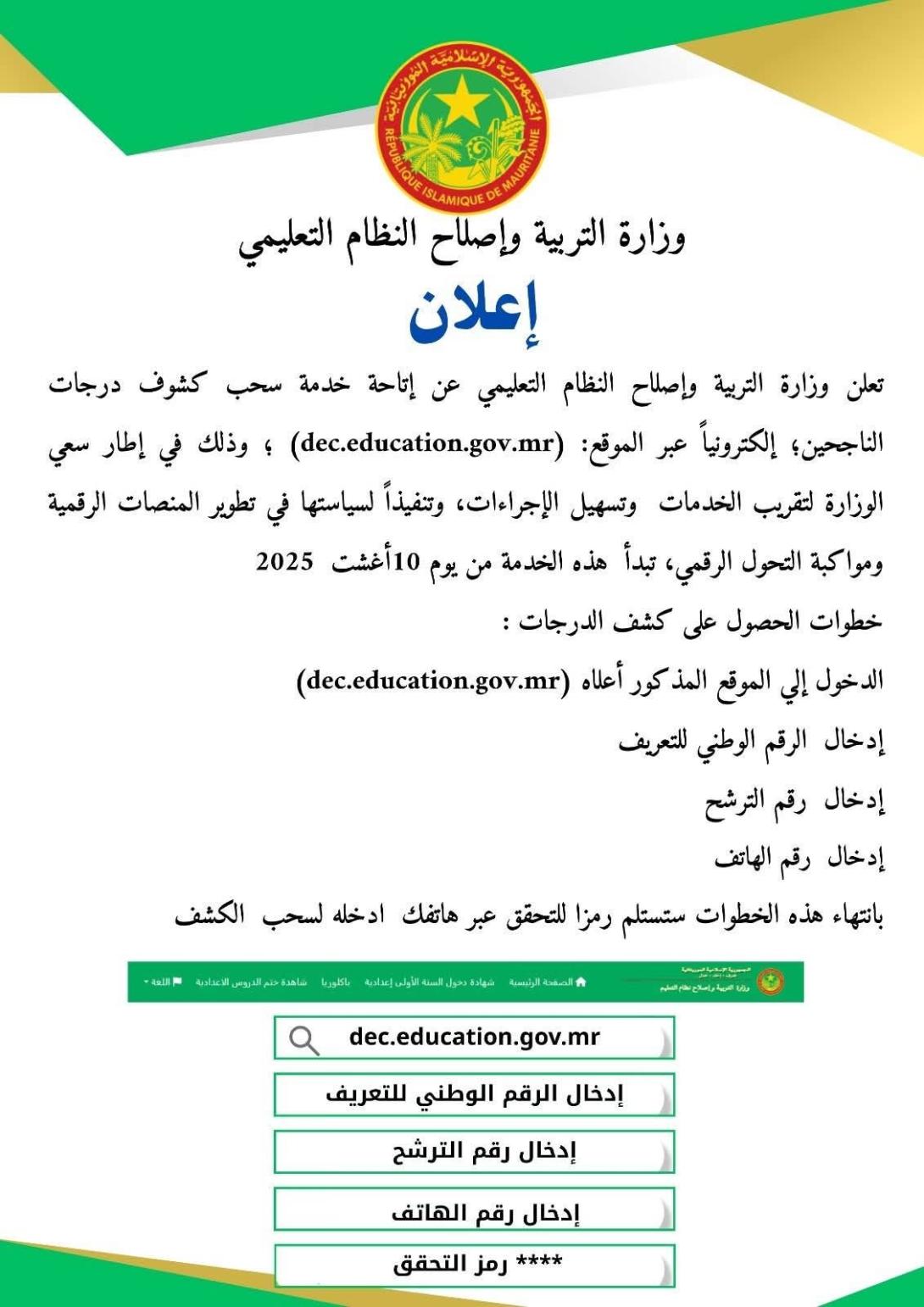 أعلنت وزارة التربية وإصلاح النظام التعليمي عن إطلاق خدمة إلكترونية جديدة تتيح للناجحين في شهادة البكالوريا لهذا العام سحب كشوف درجاتهم عبر الموقع الرسمي: dec.education.gov.mr.