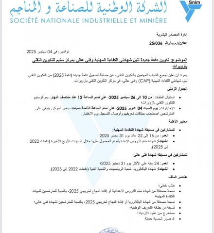 أعلنت الشركة الوطنية للصناعة والمناجم (اسنيم) عن فتح باب الترشح لتكوين دفعة جديدة عام 2025 لنيل شهادتي الكفاءة المهنية وفني عالي في مركزها للتكوين التقني بمدينة ازويرات.