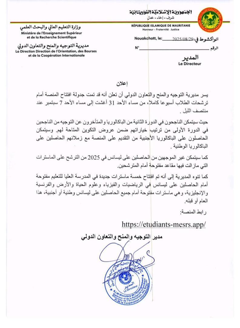 كما أعلنت الإدارة عن فتح باب الترشح لبرامج الماستر المتاحة للحاصلين على شهادة الليسانس لعام 2025 ممن لم يحصلوا على توجيه سابق، وذلك للتسجيل في المقاعد الشاغرة المتبقية.