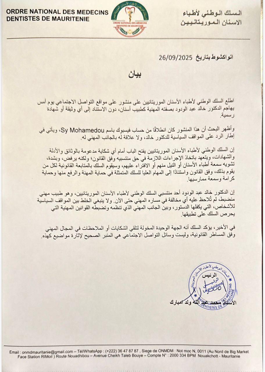 أصدر السلك الوطني لأطباء الأسنان الموريتانيين بياناً أدان فيه الحملة التي استهدفت الدكتور خالد عبد الودود على منصات التواصل الاجتماعي، معتبراً أنها تندرج في إطار "خلط غير مقبول" بين الحياة السياسية والمهام المهنية.