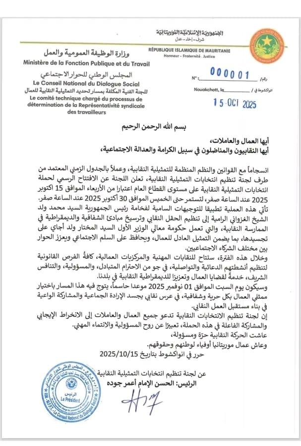 وأضافت اللجنة أن العملية تأتي تطبيقا لتوجيهات الرئيس محمد ولد الغزواني الرامية "إلى تنظيم الحقل النقابي وترسيخ مبادئ الشفافية والديمقراطية في الممارسة النقابية".