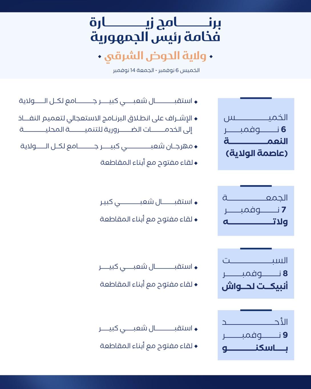 ويتضمن البرنامج الرئاسي مهرجاناً جماهيرياً وثمانية استقبالات شعبية، حيث يلتقي الرئيس مع المواطنين في كل مقاطعة من مقاطعات الولاية.