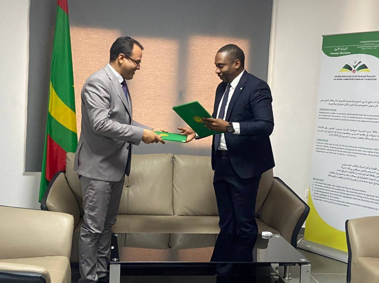 وقع المدير العام للمدرسة الوطنية للإدارة والصحافة والقضاء، الدكتور محمد يحي ولد السعيد، اليوم في نواكشوط، اتفاقية تعاون مع ممثل المنظمة الدولية للهجرة في موريتانيا، السيد إدريسا سومباري.