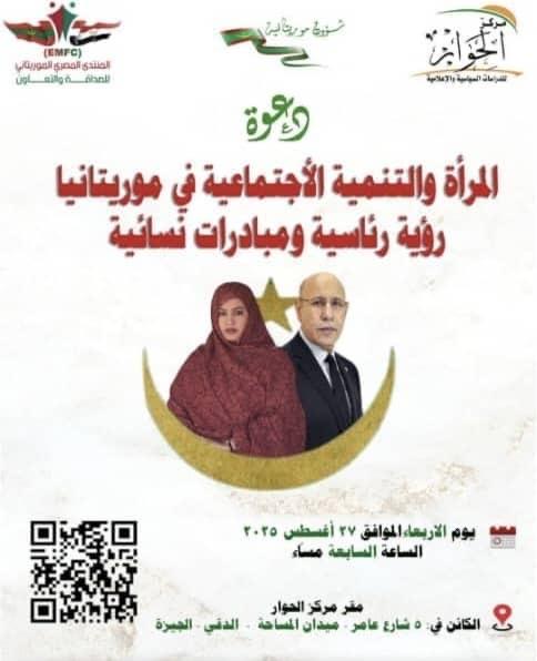 نظم مركز الحوار للدراسات والبحوث الإنسانية، بالشراكة مع المركز العربي الإفريقي للإعلام والتنمية، ندوة حوارية في القاهرة بعنوان: "المرأة والتنمية الاجتماعية في موريتانيا: رؤية رئاسية ومبادرات نسوية".