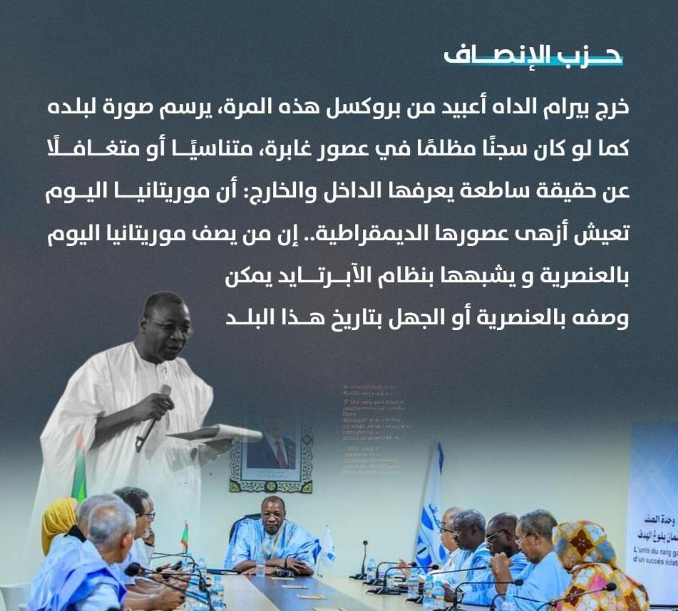 اتهم حزب الإنصاف النائب بيرام الداه أعبيد بمحاولة تشويه صورة موريتانيا دولياً، وذلك على خلفية تصريحاته الأخيرة في بروكسل التي وصف فيها البلاد بأنها "تشبه سجناً مظلماً من عصور غابرة".
