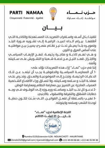 أعرب حزب "نماء"، الذي ترأسه البرلمانية السابقة زينب بنت التقي، عن أسفه البالغ إزاء التصريحات الأخيرة للنائب بيرام الداه أعبيد، واصفاً إياها بـ"الكاذبة والمستهجنة"، ومتّهماً إياه بالسعي لتشويه صورة البلاد ووصف نظامها بأنه عنصري.
