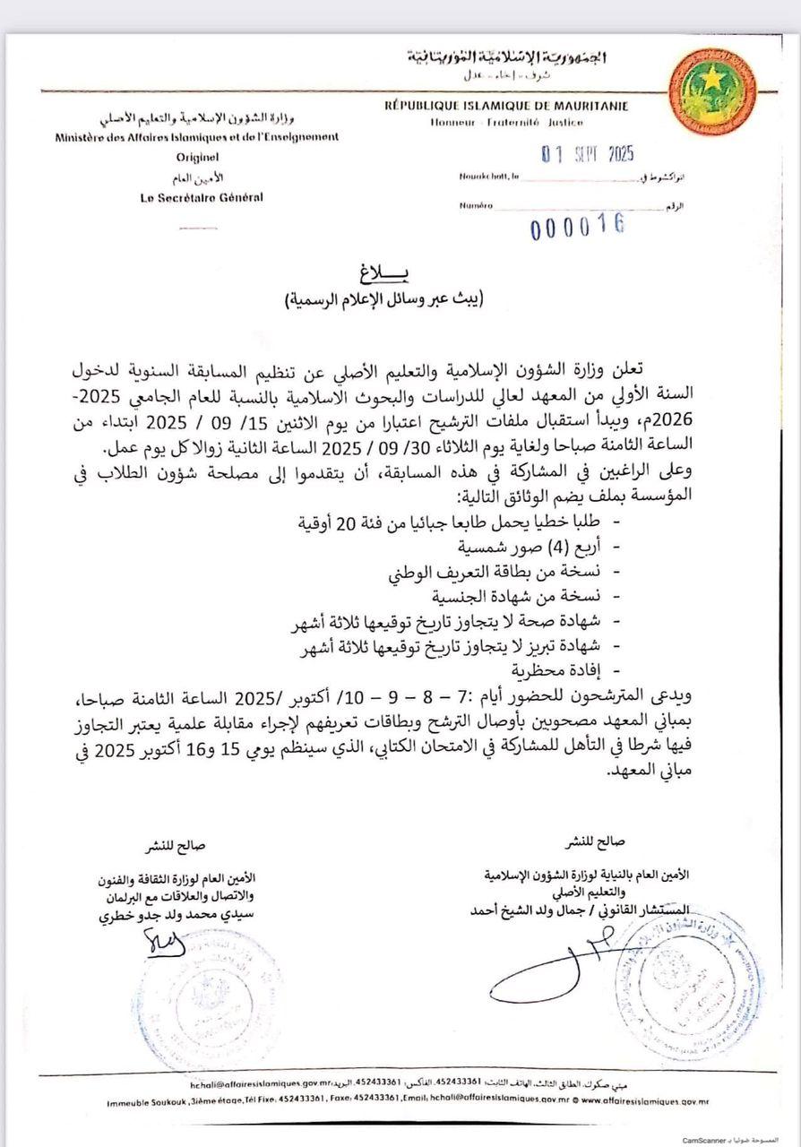أعلنت وزارة الشؤون الإسلامية والتعليم الأصلي عن فتح باب الترشح للمسابقة السنوية لدخول السنة الأولى من المعهد العالي للدراسات والبحوث الإسلامية للعام الدراسي 2025-2026.