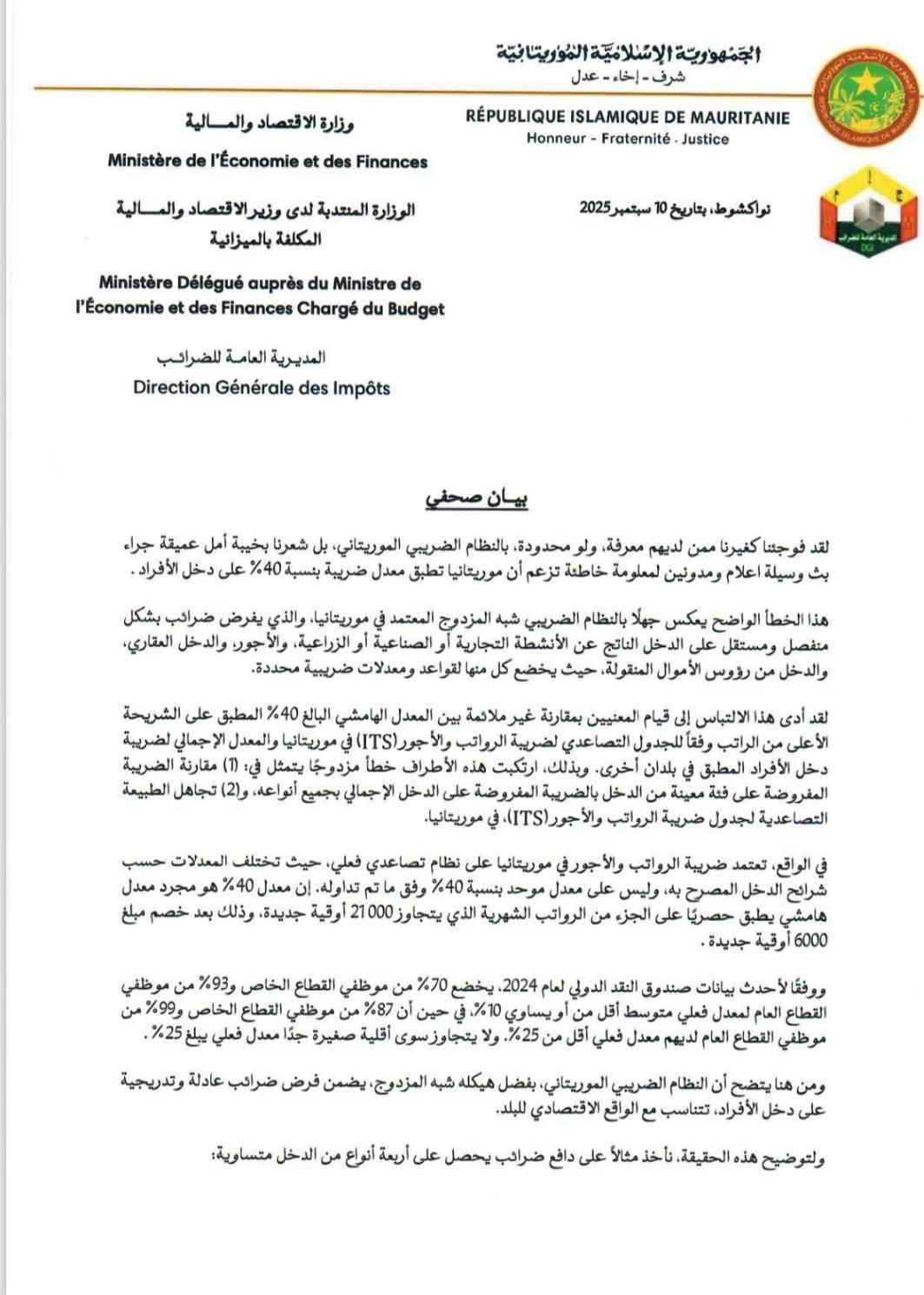 وأوضحت المديرية في بيانها أن النظام الضريبي الموريتاني يعتمد معدلات متدرجة وعادلة، حيث يبلغ متوسط معدل الضريبة في النظام شبه المزدوج 15.8% فقط، وليس النسب المرتفعة التي يتم الترويج لها.