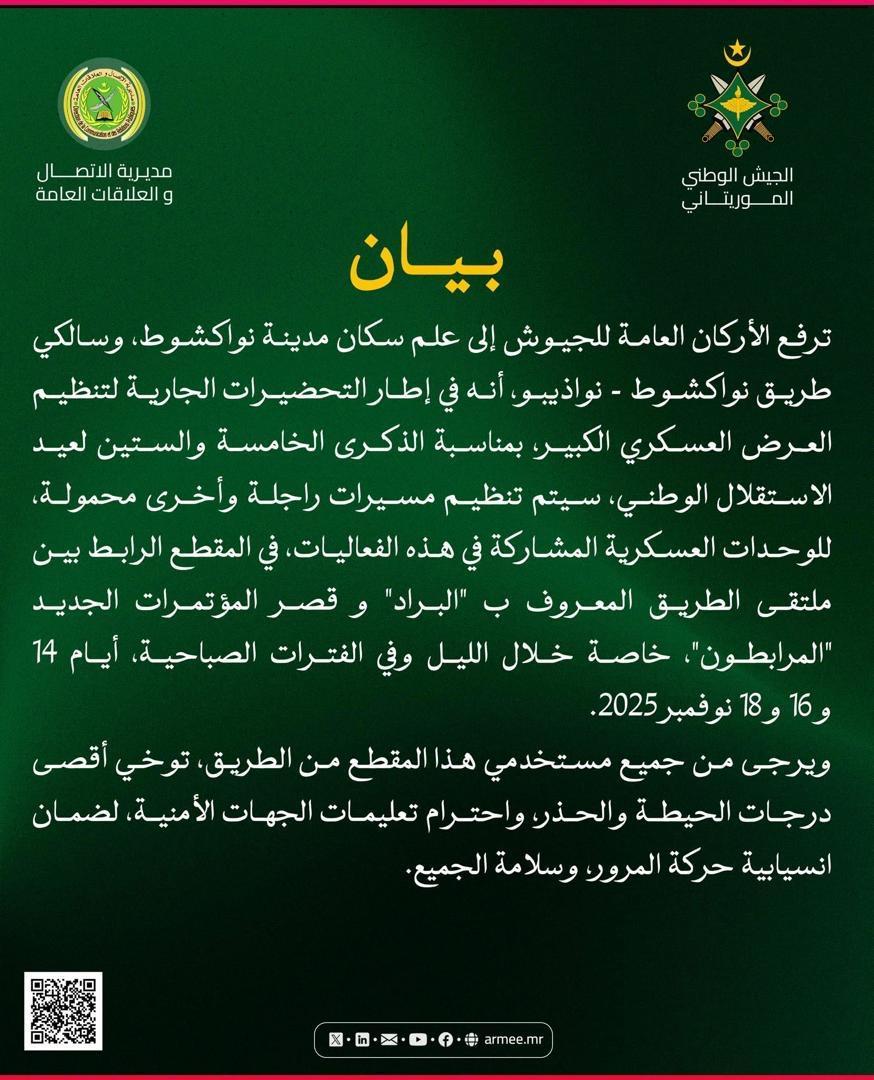 تنبه الأركان العامة للجيوش جميع المواطنين إلى إجراء تحضيرات للعرض العسكري بمناسبة عيد الاستقلال، وذلك خلال الفترات المسائية والصبحية ليومي 14 و16 و18 نوفمبر 2025.
